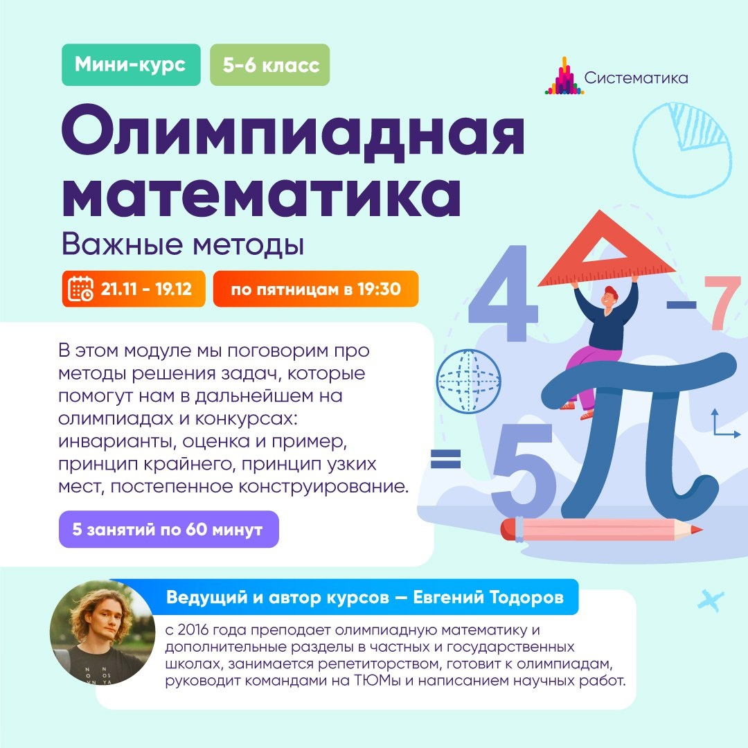 ✏️Важные методы: новый курс по олимпиадной математике для 5-6 классов Фундамент олимпиадного мышления! На курсе будем учиться видеть структуру задач и выбирать правильную стратегию решения. Освоим ключевые методы решения, которые встречаются во всех олимпиадных задачах. ✅ Научимся выбирать удобные способы вычислений ✅ Разберём, как рассуждать и действовать шаг за шагом ✅ Научимся видеть ловушки и искать короткий путь к ответу ✅ Получим инструменты для системного анализа и решения сложных задач «Важные методы» Даты: 21 ноября — 19 декабря • 5 занятий по 60 минут 🔘Занятия проходят раз в неделю по пятницам в 19:30 (мск) 🔘Подключайтесь онлайн, чтобы задавать вопросы преподавателю 🔘Если пропустили — смотрите занятие в записи на платформе Ведущий и автор курса — Евгений Тодоров — с 2016 года преподает олимпиадную математику и дополнительные разделы в частных и государственных школах, занимается репетиторством, готовит к олимпиадам, руководит командами на ТЮМы и написанием научных раб