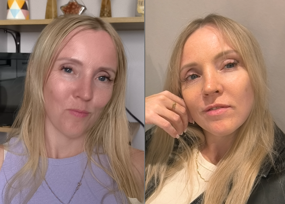Первое фото сделано в августе 2024 года, второе в ноябре 2025 года. На обоих нет никакого макияжа - только наращенные ресницы. Оба с легкой улыбкой.