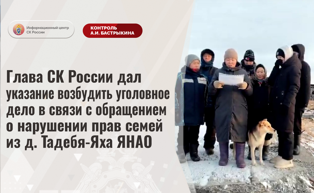 Глава СК России дал указание возбудить уголовное дело в связи с обращением о нарушении прав семей из д. Тадебя-Яха Ямало-Ненецкого автономного округа В комментариях в аккаунте Информационного центра СК России «ВКонтакте» размещено видеообращение к Председателю СК России А.И. Бастрыкину семей из деревни Тадебя-Яха Тазовского района Ямало-Ненецкого автономного округа, относящихся к числу коренных малочисленных народов Севера, по вопросу нарушения их прав. Более 20 лет граждане проживают в ветхих производственных вагончиках 1970-х годов постройки без тепло -, электро- и водоснабжения. Семьи с детьми вынуждены осуществлять забор питьевого ресурса из реки и обогревать жилища с помощью печей. В населенном пункте отсутствуют социально значимые объекты и медицинские учреждения. Доставка продуктов питания осуществляется со значительными задержками. Обращения в компетентные органы с просьбой предоставить заявителям благоустроенные жилые помещения в районном центре результатов не принесли. В СУ С