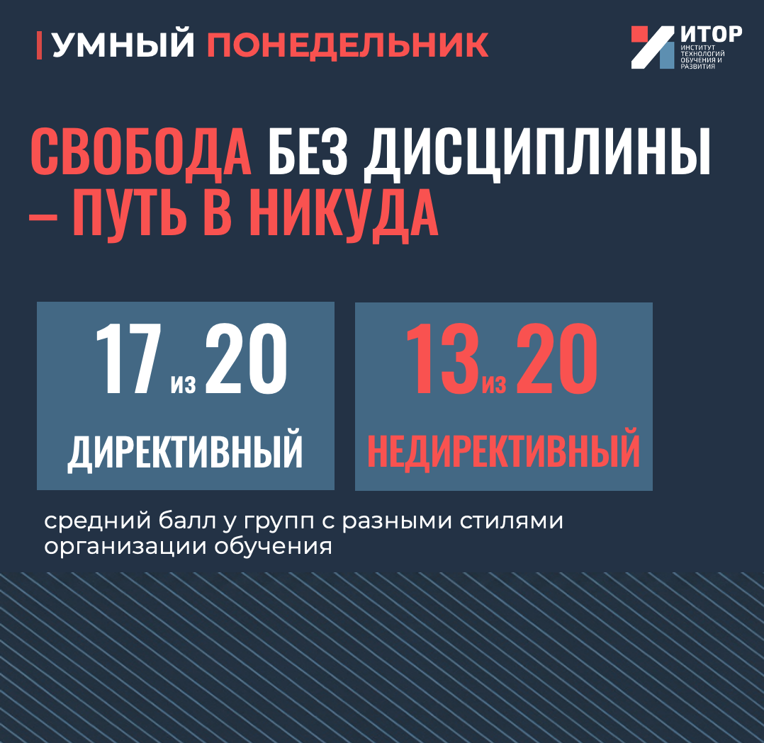 Вместе с этим, использование директивного подхода не имело под собой целью полное изъятие свободы у обучающегося, ибо при этом отсутствует и ответственность. Присутствие контроля не было подавляющим, что впоследствии отметили сами сотрудники, а возможные трудности разбирались куратором и учеником в индивидуальном порядке.