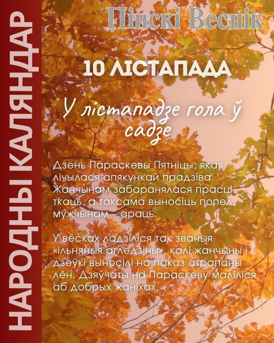 10 лістапада 🔸Дзень Параскевы Пятніцы, якая лічылася апякункай прадзіва. Жанчынам забаранялася прасці, ткаць, а таксама выносіць попел, мужчынам – араць. У вёсках ладзіліся так званыя «ільняныя агледзіны», калі жанчыны і дзеўкі выносілі на паказ атрапаны лён. 🔸Дзяўчаты на Параскеву маліліся аб добрых жаніхах. #народны_каляндар @Пинский Вестник ЮТУБ | САЙТ| ИНСТ | ВК | ОК | ФЕ | Прислать новость