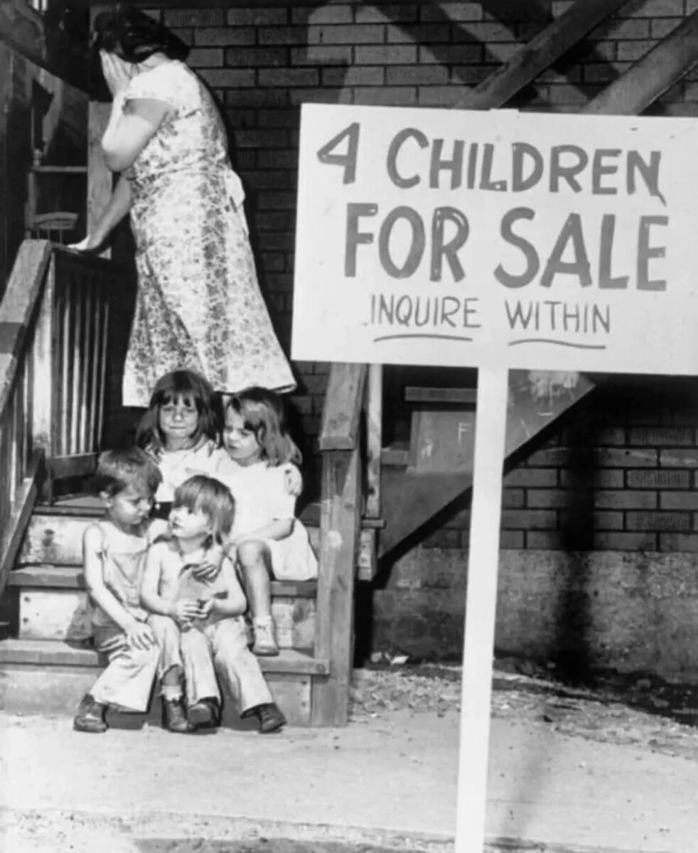 На фотографии «4 ребёнка на продажу» 1948 года запечатлена чикагская мать Люсиль Шалифу, которая прячет лицо, пока её четверо маленьких