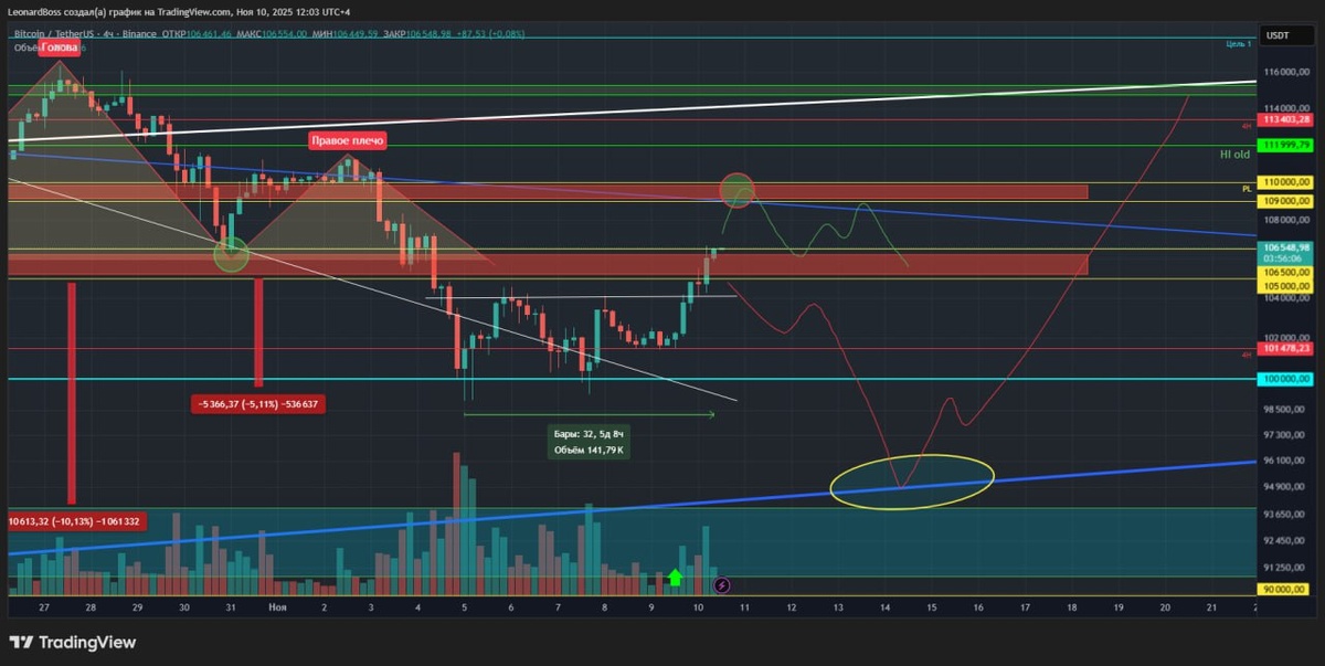 В ответ на пост #мнениепорынку 🕯🕯🕯 ⚠️Итак, коллеги, вечеринка вчера состоялась, кто не был занят уничтожением остатков пиваса выходного дня, могли забрать профит вчера, либо уже сегодня, отловив отличные ТВХ воскресенья!! ⚠️BTC закрыл GEP над головой, тем самым открыв очередной GEP снизу, с нижней границей уровня 104К, который находится достаточно близко и обычная сопля на 2-3% мгновенно его закроет!! ⚠️Также, прямо сейчас цена штурмует блок сопротивления, который совместно с блоком выше отрабатывают достаточно мощно с мая текущего года и на протяжении всех 6 месяцев. Вы также могли в этом убедиться неоднократно!! ⚠️Таким образом, зеленый сценарий увезет цену к блоку выше, лишь после закрепа над блоком текущим, как минимум на 4Н ТФ. Пока же, не смотря на закрытие 2х зеленых 4Н свечей, просится обратный ретест уровня поджатия, который был пробит вчера вечером = закрытие GEP!! ‼️При этом, красный сценарий подразумевает поход графика к нижней трендовой, теперь уже в случае, если п