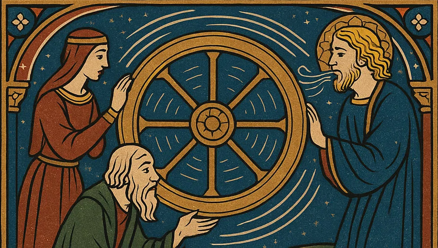 В центре мира вращается Колесо, и никто не знает, кто его крутит. Одни говорят — Судьба, другие — Время, третьи шепчут, что это дыхание Бога, медленно превращающее вечность в миг, однако всякий, кто хоть раз прикоснулся к ободу этого колеса, знает, что его вращение не случайно, не хаотично, оно подчинено ритму. Колесо Фортуны расскажет не о том, что меняется, а о том, что вращается. Из одной и той же точки вырастает подъем и падение, встреча и утрата, свет и тень. Все это разные фазы одного круговорота. Время в Аркане не течет линейно, как река, напротив оно дышит, как существо. Вдох — восхождение, выдох — нисхождение. На лезвии этого дыхания человек живет. Пусть он зовет случайностью то, что не успел распознать как закономерность, видит фортуну там, где действует ритм, у Колеса свой Закон, случай — тайная форма порядка, еще не осознанная взглядом. Верх не лучше низа, и низ не наказание. Это две стороны одного пульса, двухтактное сердце Мира. Каждое вращение колеса, словно момент памят