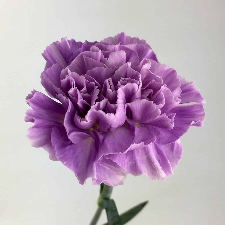 Гвоздика "Moondust" привлекает внимание своим оригинальным внешним видом. Ее главная отличительная черта – это уникальная лавандово-синяя окраска цветков, которая делает ее по-настоящему исключительной на фоне традиционных розовых, красных и белых гвоздик. Цветки крупные, с пятью лепестками, имеющими характерную гофрированную форму. Эта особенность придает цветкам дополнительную декоративность и изысканность.