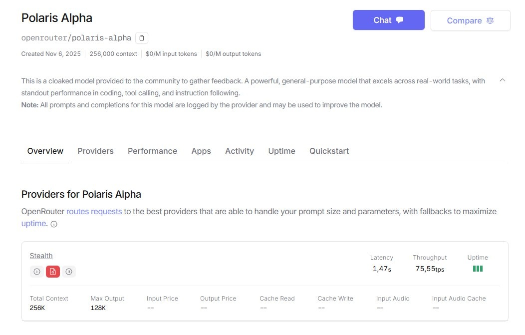 Polaris Alpha GPT-5.1? 256,000 токенов контекстного окна, отличная производительность в кодинге, вызове инструментов и следовании инструкциям, оптимизирована для системной автоматизации и рабочих процессов Очень хорошо работает с кодом, интегрируется с инструментами, хорошо следует инструкциям, зайдет для автоматизации систем На реддите все говорят, что это может быть GPT-5.1, учитывая, что предыдущие кодовые имена OpenRouter (Cypher Alpha и Quasar Alpha) были версиями GPT-4.1. Пока модель не поддерживает reasoning трудно полностью оценивать ее возможности, сама по себе она имеет характерный стиль UI-вывода, хотя некоторые говорят он не такой креативный как Gemini 3 https://openrouter.ai/openrouter/polaris-alpha