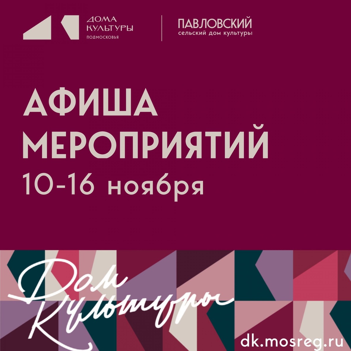 ✨ 🌟 Афиша мероприятий на неделю 🌟 Дорогие друзья! Приглашаем вас провести насыщенную и творческую неделю вместе с нашим Домом культуры. У нас запланированы интересные события для детей и взрослых — выбирайте то, что по душе! 🎨 11 ноября, 16:00 - «Очумелые ручки» мастер‑класс по декоративно‑прикладному творчеству, приуроченный ко Дню рукоделия. 6+ 🔹 Важно: требуется предварительная запись в группе ДК. 🙏🏻 12 ноября, 17:00 - «Твори добро!» акция помощи благополучателям. 12+ 🍿12 ноября, 19:00 - «Мультпоказ» семейный кинопросмотр 6+ 🎅🏼 13 ноября, 16:00 - «Подарок Деду Морозу» мастер‑класс по созданию поделок ко Дню рождения Деда Мороза. 6+ 🏢 Павловский сельский дом культуры (СДК) 📍 г.о.Домодедово, дер.Павловское, ул.Вокзальная, д.18 ✅ Мероприятия Домодедово https://dzen.ru/id/66f10385cc4c5a16f7b5fb02 http://vk.com/domodedovo_events http://dzen.ru/domodedovo_events