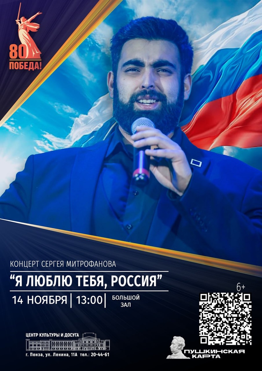 ✅ 14 ноября -13:00 ✅ 26 ноября -13:15, - 14:30 🇷🇺 Патриотический концерт Сергея Митрофанова «Я люблю тебя, Россия» ко Дню народного единства. 🎵 В программе выступит лауреат Всероссийских и Международных конкурсов, победитель российской студенческой весны, обладатель благодарственных писем Пензенской области, Азербайджанской Республики, Орловской области, Республики Беларусь, солист Сергей Митрофанов. 🎶 Имя этого солиста широко известно в Пензе, это талантливый артист, исполнитель академического вокала, советской эстрады. В концерте прозвучат известные композиции: «Марш энтузиастов», «Любимый город», «Жди меня», «Катюша», «Дорога на Берлин», «Главное ребята», «Земля в иллюминаторе», «До свидания, Москва», «Я люблю тебя жизнь», «От чего так березы шумят» и другие. 🎤 Ведущая – Татьяна Митрофанова. 6+ * ПУШКИНСКАЯ КАРТА ✅ Онлайн билеты: goo.su/YBMUU