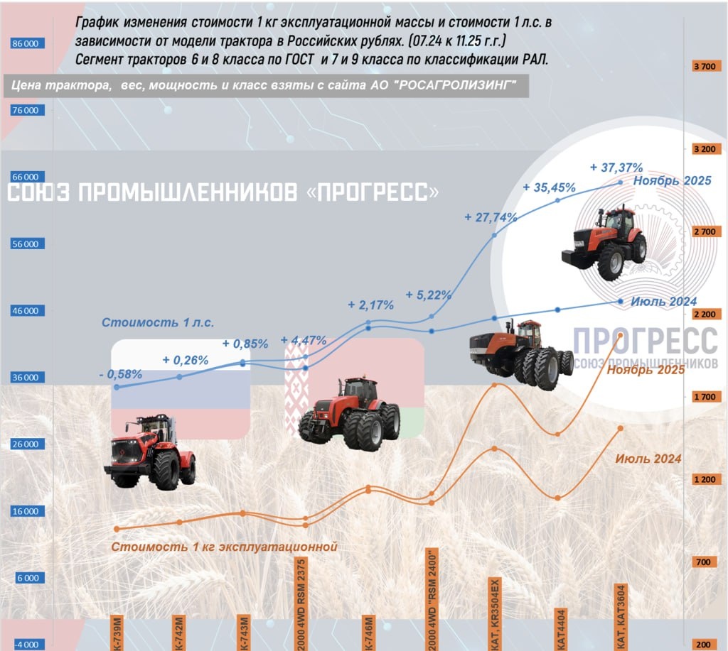 Производителей сельхозтехники несправедливо критикуют за повышение цен на продукцию, заводы на самом деле сдерживают кризис на рынке, утверждают в Союзе промышленников «Прогресс». Авторы исследования рассмотрели цены на на тяжёлую тракторную технику по двум ключевым параметрам: стоимости лошадиной силы и килограмма веса. Также для анализа использовались прямые цены производителей на сайте «Росагролизинга»: — Как наглядно демонстрирует график, ценовая политика российских производителей отличалась значительной сдержанностью. Рост цен не только не достиг уровня инфляции, но в отдельных случаях был близок к нулевому. Например: в ноябре 2025 года самая востребованная комплектация трактора Кировец тип К-7М вариант К-743М в комплектации: 430 л.с., Weichai; КП 16/8 четырехрежимная с силовым переключением; колеса одинарные 710/70 R38; МОМ; СПВ; КП 43549А стоит 16 517 тыс. руб. при этом аналогичная комплектация для июля 2024 года 16 377 тыс. руб. рост составил не более 0,85%. На основании исс