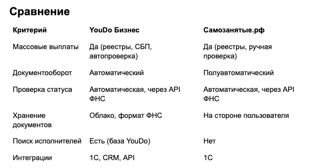Обе платформы легально работают с ФНС и помогают выстраивать работу с самозанятыми по закону, но отличаются подходом, глубиной автоматизации и удобством.