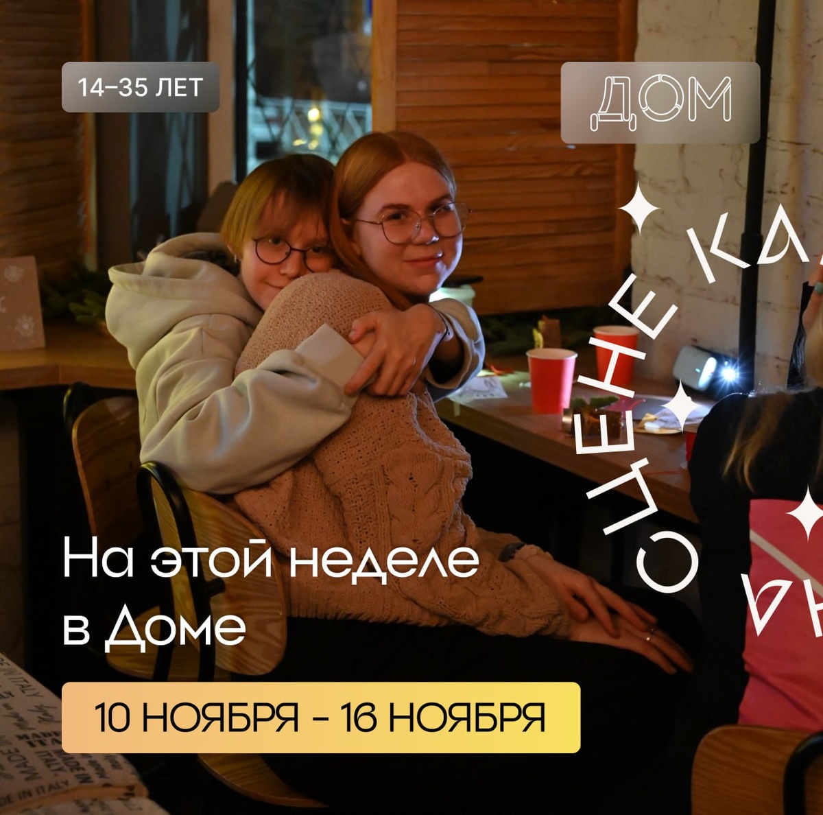 🎭На этой неделе в Доме: ⭐️ 14 ноября | 19:30 Театр-лаборатория «Я» Тренинг по методам расслабления, которые используются в театральной практике. Поможет снять стресс, повысить энергию и креативность! Бери с собой сменную одежду, обувь и, при желании, плед для комфортного занятия. ⭐️14 ноября | 19:30 «Актер, зритель и автор: от Древней Греции до наших дней» Исследуй эволюцию театральной коммуникации, роль зрителя и причины, по которым подлинное взаимопонимание в театре не всегда достижимо. Что зрители и создатели ожидают друг от друга и как меняется роль зрителя в современном спектакле? ⭐️ 15 ноября | 16:00 Мастер-класс по актерской технике Н.В. Демидова «Живи. Играй. Чувствуй» Это занятие поможет раскрыть свои эмоции, научиться слушать себя и свободно выражать внутренние импульсы через телесные упражнения и театральные практики. В увлекательной форме ты сможешь изучить природу импровизации и расслабления. ⭐️ 15 ноября | 19:00 Мастер-класс по ходулям от Театра СоЛу Погрузись в увле