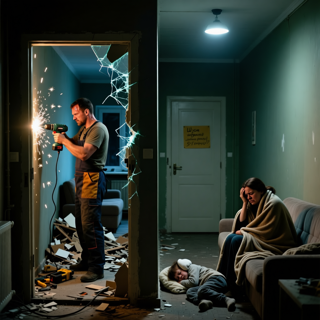Но судьба, видимо, решила проверить, насколько я настоящий — и отправила мне соседа сверху. Глава 1. День первый: звук, от которого мурашки… и не от восторга В 7:03 утра раздался звук, который невозможно описать словами. Представьте: дятел, запущенный на реактивной тяге, долбит по вашему черепу в ритме техно. Я резко сел в кровати, сердце колотилось, как будто я только что отказался платить за подписку на стриминговый сервис в разгар сериала. — Это… перфоратор? — прошептал я, дрожащим голосом. Рядом жена шепчет молитву — не на церковнославянском, а на языке строительных норм: Кот сидит в ванной под ванной. В боксе из коробки от IKEA. С надписью: «Не трогать. Психологическая помощь». Жена, сонно:
