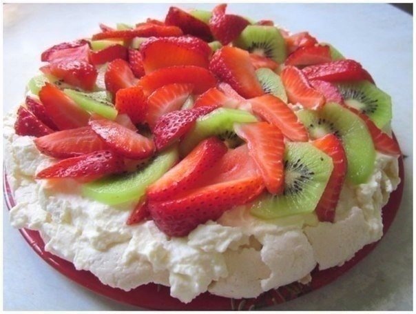Ингредиенты: 4 шт. охлажденных белков 1 ч. л. белого винного уксуса или яблочного (можно лимонный сок) 1 ст. мелкого сахарного песка 3 ч. л. крахмала 200 г жирных сливок 38% (охлажденных) 2 ч. л. сахарной пудры с ванилью 2 шт. киви 200 г клубники Можно украсить по-другому. Главное — не отступать от классики — ягоды и тропические фрукты. В Англии этот торт украшают малиной. Приготовление: В белки добавить уксус и взбивать на небольшой скорости. Как только белки взобьются в устойчивую пену, начинайте понемногу добавлять сахар. Взбиваем минут 5–7, добавляем крахмал. Безе готово. На бумаге для выпечки нарисовать круг диаметром 20 см. Перевернуть и аккуратно выложить безе. Разровнять и выпекать в разогретой духовке 40-50 минут при температуре 150* Отключить духовку, безе не вынимать до полного остывания духовки. Безе удобно печь накануне, а украшать перед подачей на стол. Фрукты и ягоды вымыть, обсушить и порезать. Сливки вбивать в течение 4–5 минут. Добавить 2 ч. л. сахарной пудры