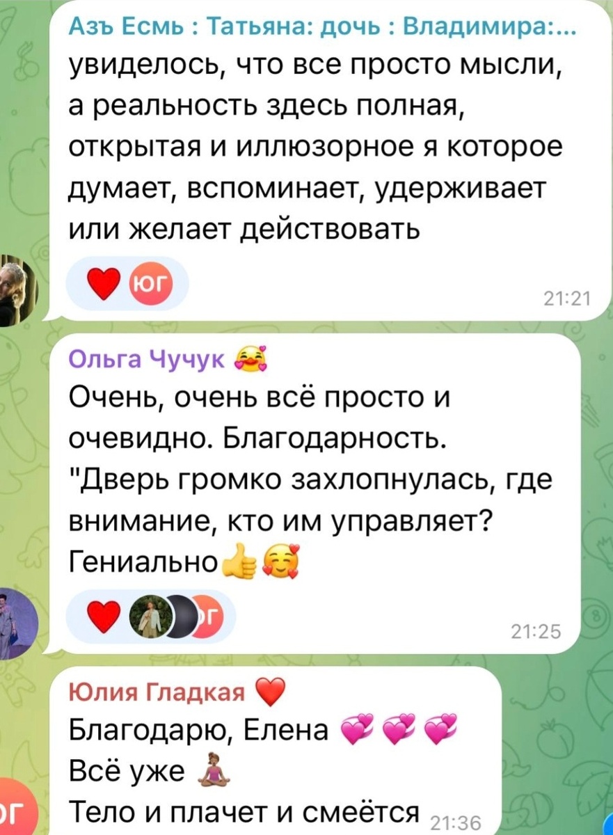 В субботу на прямом эфире раскрылась иллюзия идеи пути: ✔️Как звучит иллюзия пути ✔️За какими разумными масками скрывается иллюзия пути ✔️Возможно ли найти начало пути? ✔️Глубокие указатели: ✔️В какой момент прошлое становится будущим? ✔️А также приоткрылось что ожидается на легендарной «Глубокой высоте–2025» и многое другое смотрите в записи эфира⬇️ Смотреть запись эфира 🔥Первые впечатления участников эфира⬇️ Эфир не для понимания, смотрите, слушайте – что ощущается, узнаётся? 📲 Пишите комментарии с впечатлениями об эфире и участвуйте в розыгрыше (какой именно продукт обозначим на следующем эфире). 🇯🇵 Когда вы получите это письмо, я буду уже в Японии, ожидать прибытия участников тренинга-путешествия «Совершенство без создателя»: Как живет красота, если она не нуждается в свидетеле? Вы можете присоединиться к нам в уникальном онлайн-формате «ПРИСУТСТВИЕ» – это отдельный самодостаточный процесс, раскрывающийся параллельно тренингу. Это всегда ярко, глубоко, красиво, легко!❤️ ❗Не п