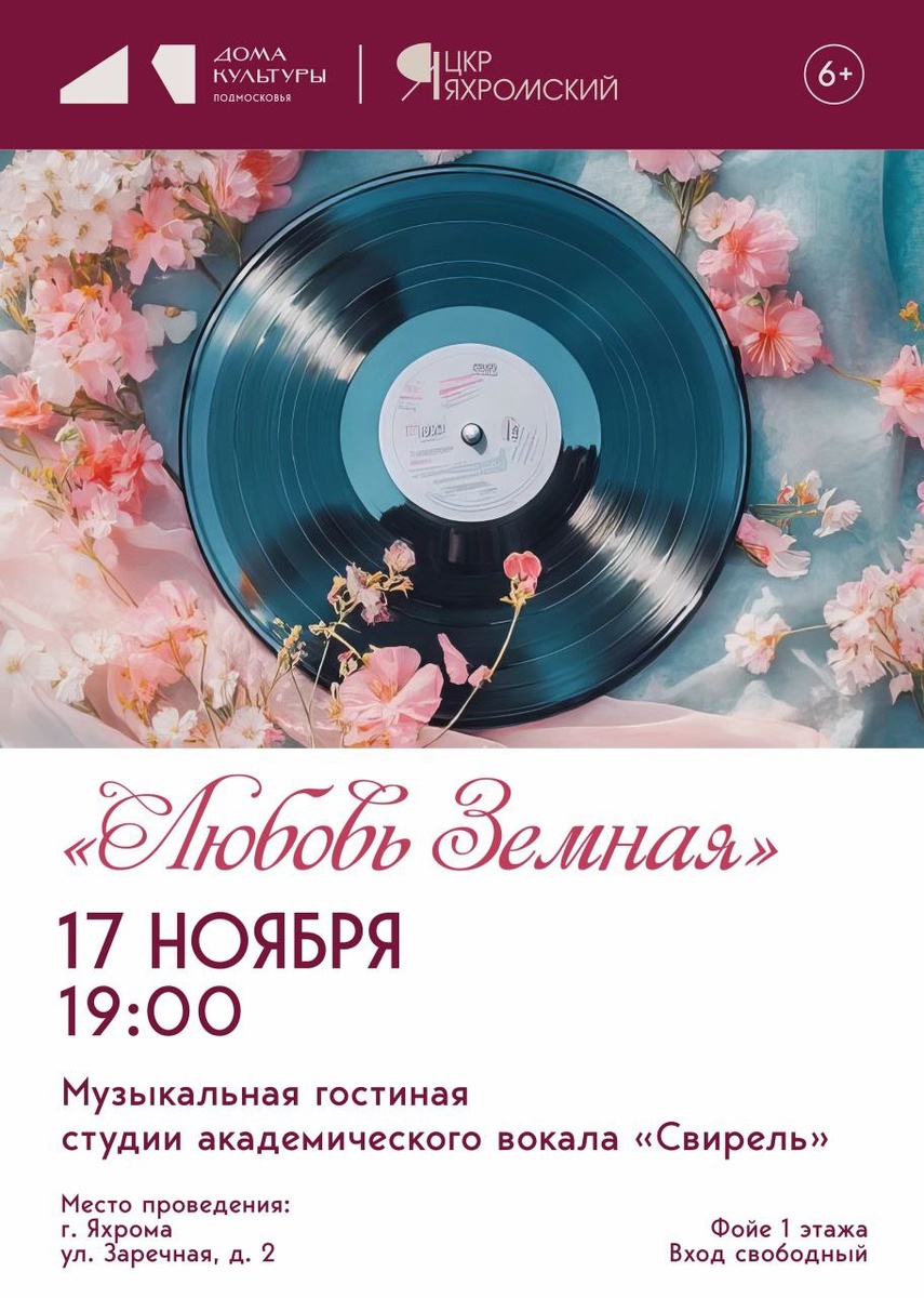 🌟 Приглашаем вас на незабываемый вечер песни «Любовь Земная»! 🎶❤️🔥 Студия академического вокала «Свирель» с радостью приглашает всех ценителей прекрасного наполнить сердце теплом и душевным наслаждением. В этот волшебный вечер вас ждут любимые песни на стихи Роберта Рождественского и Николая Добронравова — классика, которая тронет каждую душу. ✨ В программе: 🎼 Песни с музыкой выдающихся композиторов: М. Таривердиева, Е. Доги, А. Пахмутовой, В. Мигули, Е. Птичкина, Е. Крылатова 🎤 Исполнение в акустике и в компании единомышленников 📅 17 ноября ⏰ 19:00 📍 Центр культурного развития «Яхромский», Фойе 1 этажа, г. Яхрома, ул. Заречная, д. 2 🔓 Вход свободный! Приходите с друзьями, родственниками и близкими — споём вместе! 👫 Возрастное ограничение: 6+ Не пропустите шанс погрузиться в атмосферу искренней музыки и дружеского общения. Ждём вас на нашем музыкальном вечере! 🎶✨