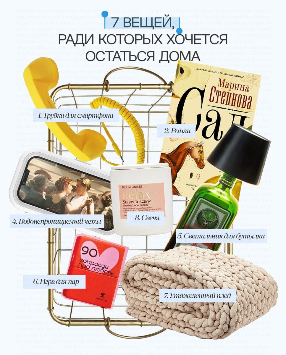 Собрали вещи, которые делают дом особенно притягательным: уютным, живым, немного ленивым и очень личным ❤️ • Трубка для смартфона • Роман Марины Степновой • Свеча Bloomcandles Relax • Водонепроницаемый футляр для телефона • Светильник-ночник для бутылки • Игра для пар «90 вопросов про любовь» • Утяжеленный плед