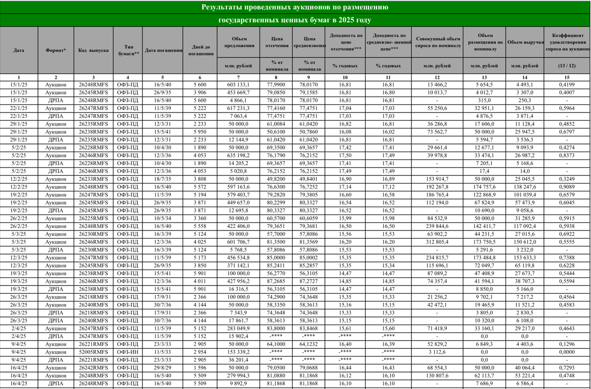 За январь-октябрь 2025 года: Минфин получил с рынка ОФЗ на 889 млрд руб больше, чем выплатил инвесторам. За январь-ноябрь Минфин РФ разместил следующие выпуски ОФЗ, выручив 4 466 млрд руб. При этом в январе было выплачено: 628 млрд руб в феврале: 71.5 млрд руб. в марте: 469 млрд руб. в апреле: 235 млрд руб. в мае: 177 млрд руб. в июне: 409 млрд. руб. в июле: 697 млрд. руб. в августе: 74 млрд. руб. в сентябре: 515 млрд. руб. в октябре: 297 млрд. руб. в ноябре: 662 млрд. руб. В итоге за 11 месяцев выплаты по ОФЗ составили 3 576 млрд. руб. Общий положительный баланс погашений/размещений резко вырос до 2 248 млрд руб. Но такой рост баланса во многом связан с двумя рекордными аукционами по размещению флоатеров, ОФЗ ПК, в ноябре с общей выручкой 1 601 млрд руб. Диаграммы по балансу рынка ОФЗ: Удачи и трезвого анализа в ваших инвестициях!!! P.S. Подписывайтесь на мой телеграмм-канал: https://t.me/Cervonets