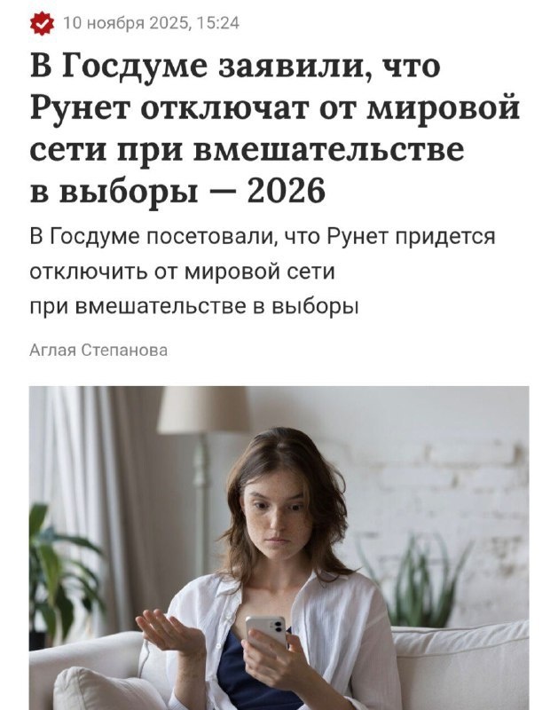 В Госдуме сообщили, что Рунет могут изолировать от глобального интернета в случае вмешательства в выборы 2026 года. Правительство предоставило Роскомнадзору полномочия отключать российский интернет от международного в случае «угрозы нарушения информационной безопасности». Эти изменения вступят в силу 1 марта 2026 года. Дополнительную информацию можно найти на сайте Роскомнадзора. Постмейкер - автоматическое ведение канала 🤖 Анимация | СhatGPT-4 | Помощь с резюме