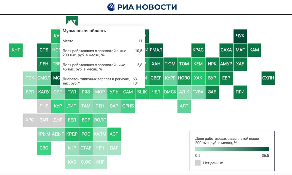 Мурманская область вплотную приблизилась к ТОП-10 российских регионов, в которых средняя начисленная заработная плата перевалила за 200 тыс. рублей. Согласно рейтингу РИА Новости, регион оказался на 11 месте с 10,5% долей зарабатывающих более двухсот тысяч. При этом, доля работников, получающих менее 45 тыс. рублей в месяц составляет всего 2,8%. По этому показателю Мурманская область находится на 82 месте (или на 4-м с конца). Согласно статданным, диапазон типичных зарплат в Мурманской области составялет от 63 тыс. до 131 тыс. рублей. ❄ «Арктический Обозреватель»