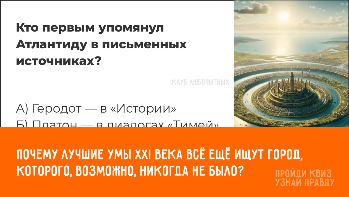 И внезапная гибель — «поглощённая морем». Но… всё это рассказал один человек: древнегреческий философ Платон — и никто до него. Была ли Атлантида предупреждением, аллегорией… или воспоминанием о реальной катастрофе? И почему в 2025 году учёные всё ещё отправляют экспедиции в Средиземное море, на Санторини и даже в Антарктиду? Этот квиз — для тех, кто не верит на слово, даже если это сказал величайший философ античности. Проверь, не ищешь ли ты её уже в своём воображении. ❓ Вопрос 1 ❓ Вопрос 2 ❓ Вопрос 3 Атлантида, возможно, никогда не существовала.