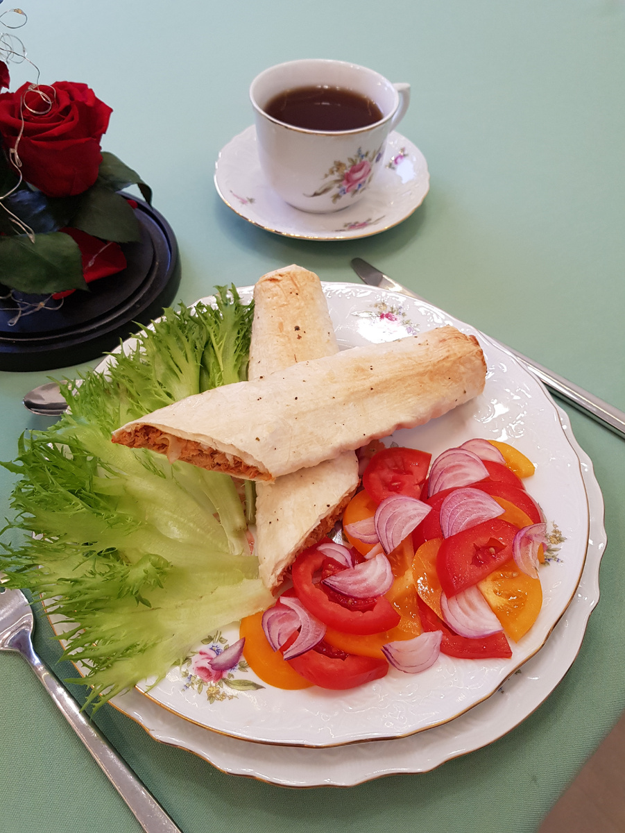 Добрый день, дорогие друзья! Сегодня хочу поделиться рецептом блюда, которое станет отличным выбором для тех, кто отправляется в дальнюю дорогу и ищет сытную, удобную еду. Для приготовления 6 порций нам понадобятся: 700 грамм отварной свинины, 450 грамм армянского лаваша, 70 грамм сыра, 50 грамм томатной пасты, 2 яйца, 2 столовые ложки майонеза. Для оформления 6 порций нам понадобятся: 300 грамм красных помидор, 300 грамм жёлтых помидор, 40 грамм красного ялтинского лука, 200 грамм салата фриллис. Приготовление: свинину нарезать мелкими кусочками. Натереть на мелкой терке сыр. Добавить к свинине сыр, томатную пасту, яйца. Перемешать. Разложить лаваш и на одну половину выложить мясо. Свернуть лаваш рулетом и выложить на противень, застеленный пергаментом. Смазать рулеты из лаваша майонезом с помощью кулинарной кисти. Запекать в течение 20 минут на режиме «Верхний и нижний нагрев» при температуре 180 градусов Цельсия. Разложить рулеты по тарелкам, дополнить блюдо листьями салата, св