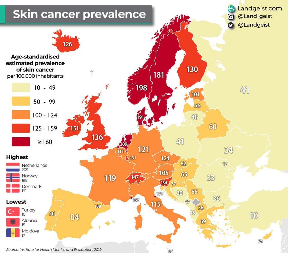 Распространенность рака кожи. Похоже, фототип важнее, чем пренебрежение защитой. У меня создалось впечатление, что в Болгарии не сильно беспокоятся о защите, и это заметно влияет на старение, а вот на распространенность рака кожи, похоже, не слишком.
