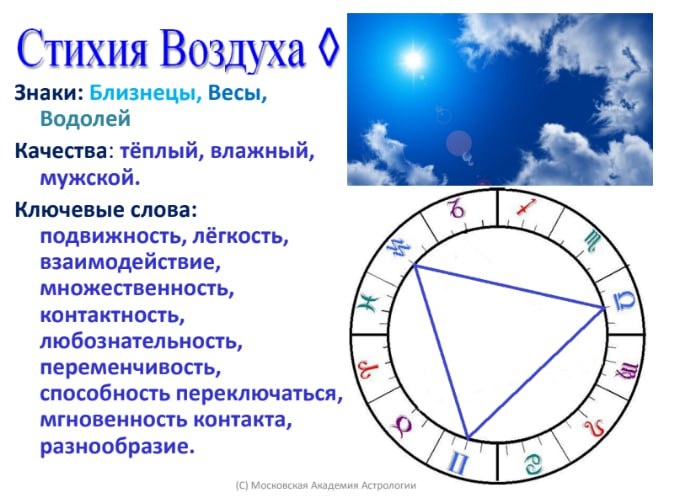 Огонь нас согрел вот здесь 🔺. А теперь на очереди следующая Стихия - Воздух 🔷. Иногда его называют Ветер. Забыла вам сказать, что мир создается Диадой, двумя фундаментальными началами - женским и мужским. Мужской принцип - активность, движение, проявление вовне, способность давать. Женский принцип - пассивность, инертность, способность удерживать, сохранять, оберегать. Огонь и Воздух имеют мужскую природу. Земля и Вода - женскую. Поэтому, все знаки Зодиака тоже несут в себе женский и мужской принцип. Таким образом, в гороскопе проявилось число 2. А теперь про Воздух. Его основные качества - легкость, подвижность, переключаемость, быстрая возбудимость, легкая смена настроения. Если проявить Воздух тремя способами (Крестами или типами активности), то мы получаем три мужских Воздушных знака Зодиака: 🔷 Кардинальный Воздух - это Весы. Уравновешивающий, гармонизирующий, взаимодействующий, склонный к компромиссу, дипломатичный. Идея установления контакта и поддержания взаимодействия в