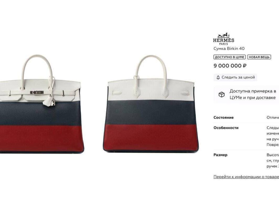 Сумка Hermes за 9.000.000₽ в ЦУМе Сумка Birkin 40 французского люксового бренда Hermes сегодня была выставлена на продажу в Московском ЦУМ Изделие украшено тремя полосами — белого, синего и красного цветов,что явно напоминает флаг России 🇷🇺 Указывается, что аксессуар находится в отличном состоянии, но имеет следы хранения и изменения оттенка на ручках и продается с поврежденной коробкой. При этом стоимость вещи составляет девять миллионов рублей😱