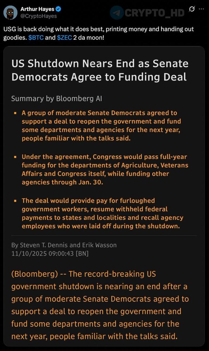 🚀 Артур Хейс ожидает «туземун» Биткоина и Zcash (#ZEC) из-за окончания шатдауна в США – twitter