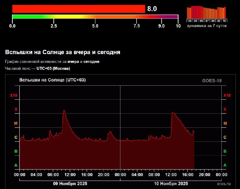 Вынужден следить за Солнечной активностью, ибо ощущаю это всем телом. Опять вспышки и сейчас сильнее, чем 3 дня назад. Инфа с сайта xras.ru Пока самая предварительная информация. На Солнце зарегистрирована повторная вспышка высшего балла X, произошедшая в той же солнечной области 4274. Максимум излучения зарегистрирован в 12:19 по Москве. Измеренный в момент пика балл — X1.21. Вчерашнее событие имело балл X1.79, так что, чисто формально, данный взрыв слабее. Теперь неформально. Вспышка, в отличие от вчерашней, показывает очень медленный спад излучения и вышла на максимуме на что-то, похожее больше на плато, чем на пик. Это ВСЕГДА — признак очень сильного выброса плазмы, причем, чем дольше длится плато, тем сильнее выброс. По сути это плато как раз и создается уже выбросом, а не вспышкой. Второе. В данный момент в сторону Земли уже распространяется выброс от произошедшей вчера вспышки уровня X, который должен по расчетам прийти 11-12 ноября.
