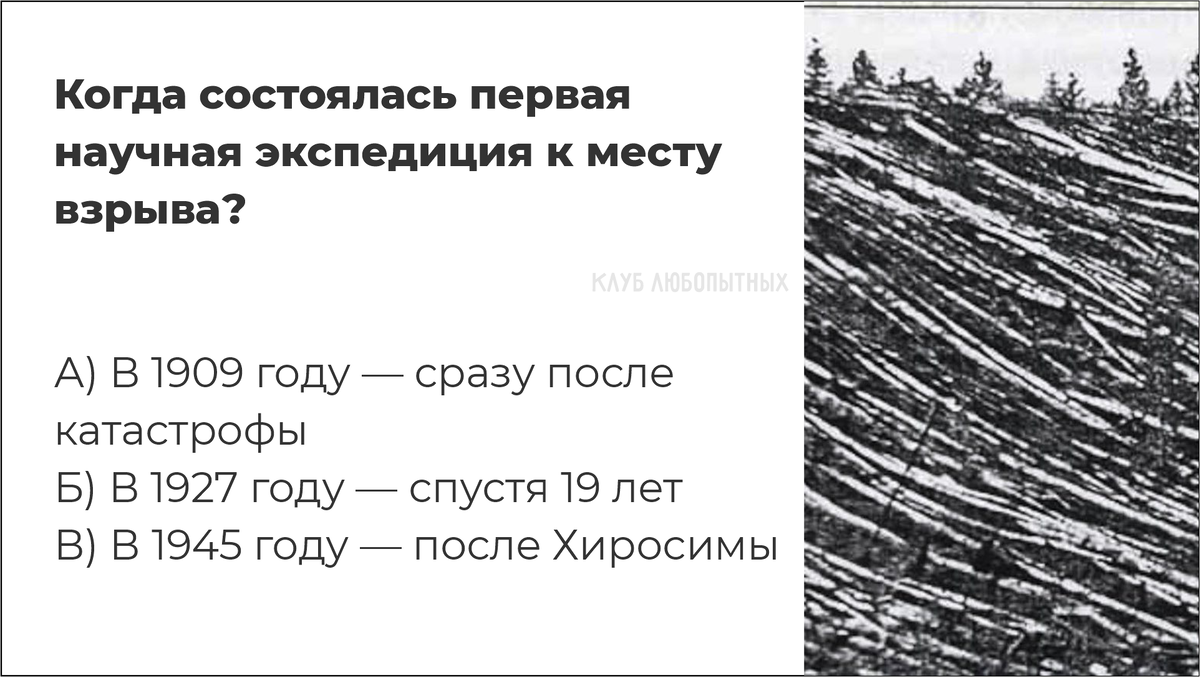30 июня 1908 года в Сибири взорвалось небо. Энергия — как у 1 000 Хиросим. Но… не было ни кратера, ни обломков. Что это было? Через 40 лет после катастрофы туда впервые поехали учёные. А очевидцы всё ещё говорили: «Там пахло серой… и стояла тишина» Добро пожаловать в «Клуб любопытных».