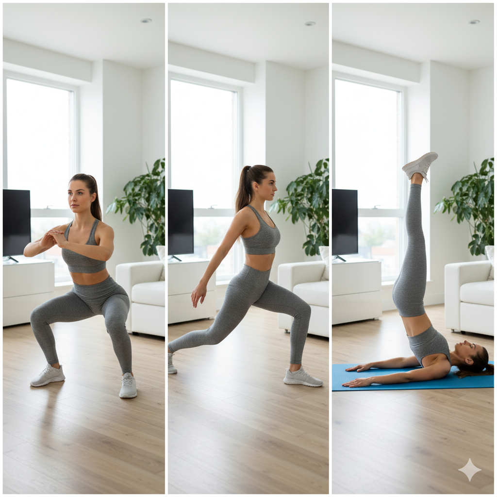 🧬 ТРЕНИРОВКА ДНЯ: Мощные ноги и упругие ягодицы (дома) Сегодня акцент на нижнюю часть тела! Эти упражнения помогут укрепить ноги, подтянуть ягодицы и улучшить выносливость. 🔥 Разминка (3 минуты): Приседания без веса, махи ногами вперед-назад, круговые вращения бедрами. Основная часть (3 круга, отдых 60 секунд между кругами): 1. Приседания с собственным весом: 15-20 повторений (Следите, чтобы колени не выходили за носки, спина прямая, опускайтесь максимально низко). 2. Боковые выпады: 10-12 повторений на каждую ногу (Шаг в сторону, сгибаем одну ногу в колене, вторая прямая. Отталкиваемся назад). 3. Подъемы на носки (стоя): 20-25 повторений (Для икроножных мышц. Можно выполнять на возвышенности для большей амплитуды). 4. Ягодичный мостик на одной ноге: 10-12 повторений на каждую ногу (Лежа на спине, одна нога согнута, другая выпрямлена вверх. Поднимайте таз, сжимая ягодицы). 5. Отведение ноги назад из положения на четвереньках: 15-20 повторений на каждую ногу