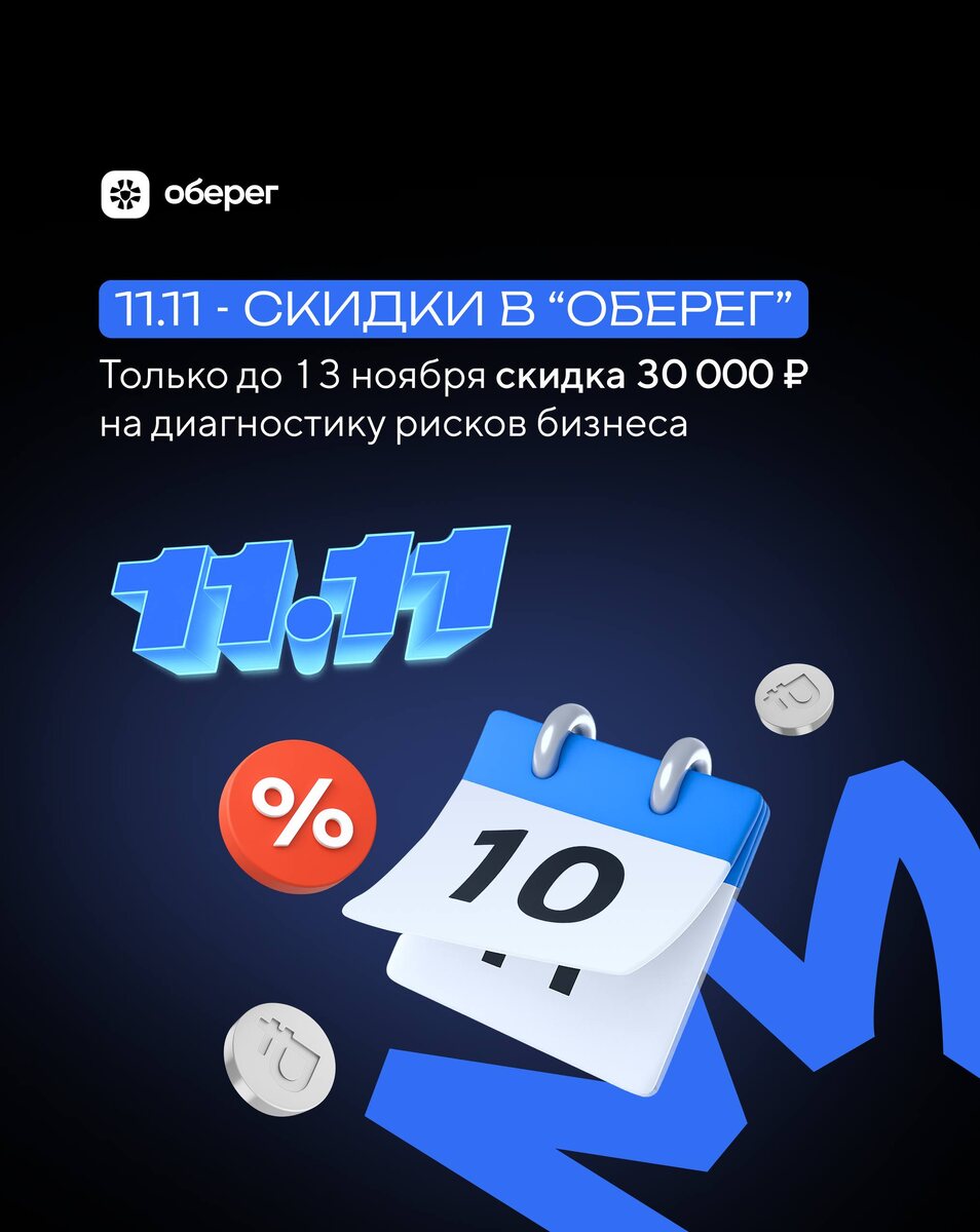 11.11 - крутые скидки в "Оберег"! Всего несколько дней провести диагностику рисков бизнеса со скидкой 30 000 ₽. 🎉 Если ты откладывал проверку по безопасности, самое время действовать ⬇️ Разберем компанию по 5 направлениям: ✅юридические, ✅налоговые, ✅кадровые, ✅финансовые, ✅риски внутреннего мошенничества 150 000 → 120 000 ₽ Чтобы зафиксировать скидку - пиши @assistent_obereg 🟠