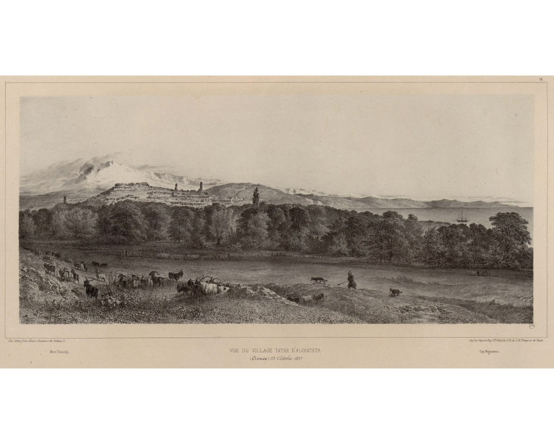 Раффе Д.-О.-М (1804—1860) Вид Алушты. (1837 г.) («Vue du village tatar d Alouchta») Из альбома «Путешествие по южной России Анатолия Демидова 1837 году». (Voyage dans Russie ...). 1838-1848. 1838 - 1848 Бумага, литография. И.:19,2 х 43,2. Л.:35,0 х 54,3 #графика #живопись #искусство #Алушта #Раффе
