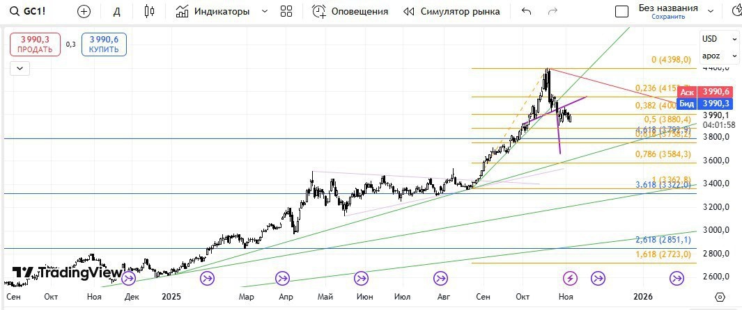 Золото опустилось к отметке $3,938 после исторического максимума в $4,379 17 октября. За три недели актив потерял около 10%, но всё ещё остаётся на 43% выше годовой давности. Что происходит – фиксация прибыли или начало глубокой коррекции? Главное давление на золото сейчас оказывают: 1. Позиция ФРС и Доллар: Укрепление доллара США и переоценка рынком перспектив снижения ставок ФРС. Заявления представителей Федрезерва создают неопределенность, отодвигая ожидания смягчения политики. Поскольку золото не приносит процентного дохода, повышение реальных ставок или отсрочка их снижения делает защитный актив менее привлекательным по сравнению с казначейскими облигациями. Индекс доллара (DXY) восстановился, что традиционно давит на номинированное в нём золото. 2. Фиксация Прибыли: После стремительного ралли в октябре на фоне геополитической напряженности часть спекулятивного капитала и ETF-фондов фиксирует прибыль, что и вызвало резкую внутридневную волатильность. 🛡 Фундаментальная подушка: Иг