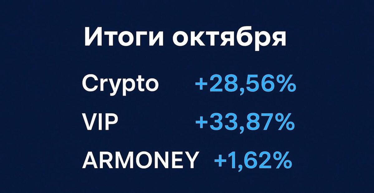 Crypto: +28.56% VIP: +33.87% ARMONEY: +1.62% Основную прибыль в этом месяце принесли золото, биткоин, эфир и пара USD/JPY. Лучшая сделка показала +12.3% прибыли. Месяц был насыщенным и волатильным, но алгоритмы ARM снова подтвердили устойчивость и эффективность подхода — контроль риска и системная диверсификация работают.
