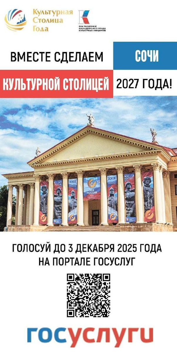 Сочи участвует в финале всероссийского голосования за звание "Культурная столица России 2027 года" Отдать свой голос в поддержку курорта можно на портале Госуслуг по ссылке pos.gosuslugi.ru/lkp/cultur... , а также отсканировав QR-код на прилагаемом изображении. Народное голосование продлится до 3 декабря. Итоги конкурса подведут 14 декабря в Национальном центре «Россия» в Москве. Вместе с Сочи в списке финалистов Вологда, Калуга, Новосибирск, Рязань, Ставрополь, Ульяновск и Челябинск. Почему Сочи решил побороться за высокое звание «Культурной столицы России»? Читать... https://ok.ru/group/70000041523919 https://vk.com/public212083585 https://dzen.ru/id/660af8bc3bd95d5b99e56429 - подпишись на СВОй "Рассвет".