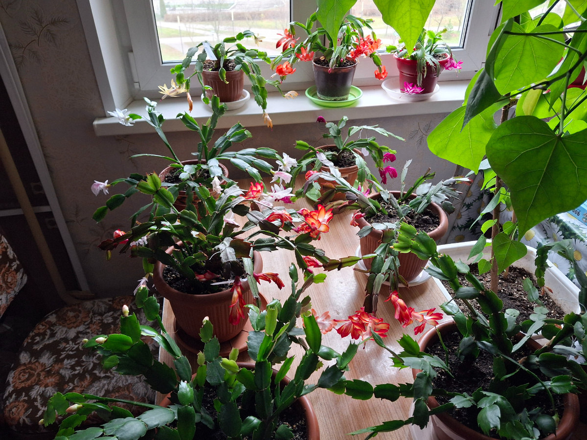 Две недели назад занесла декабристы с балкона. Они распускались в разное время, но, наконец, зацвели все. Теперь я знаю, какие у меня есть расцветки. Всего 9 горшков. Аленький цветочек. Одна штука. Рядом бело-розовый. Одна штука. Последним распустился бело-оранжевый (слева). Одна штука. Справа красно-желтый. Красно-желтый. Таких два. Цвета фуксии. Одна штука. Белый. Один. Желтый. Два горшка. Теперь надо как-то подписать, чтобы не забыть :) А то я бумажки с названием расцветок наклеила на горшки, а надписи все выцвели на балконе на солнце.