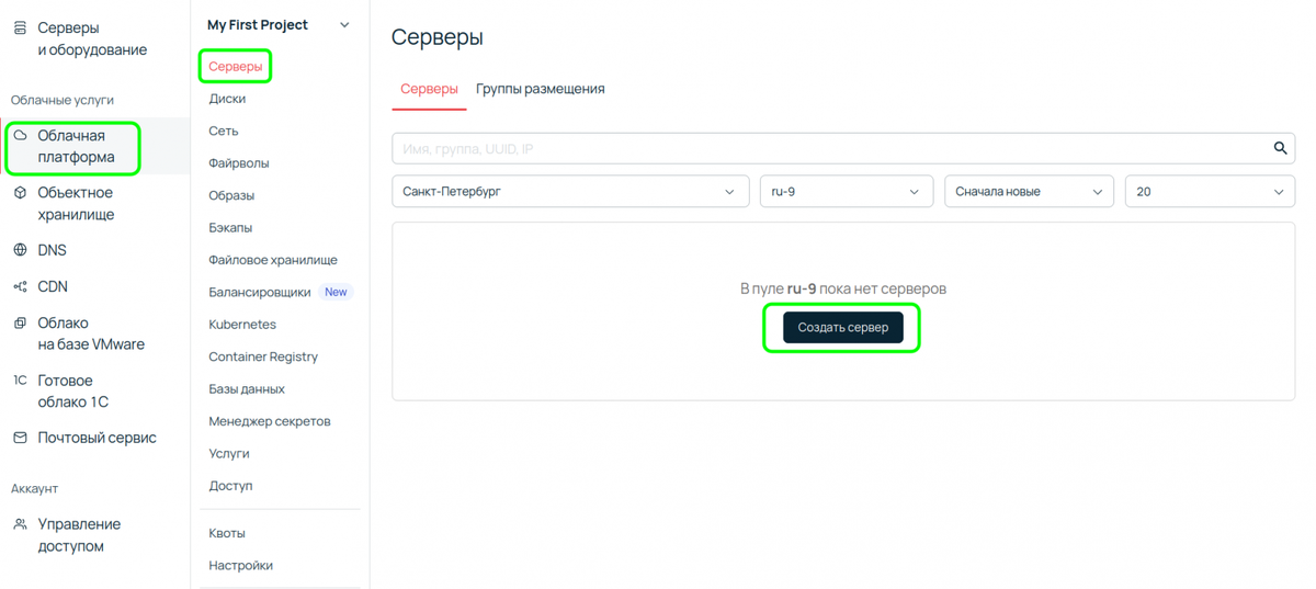 В панели управления создадим аккаунт или авторизуемся, если уже есть учетная запись. Внутри выбираем Облачная платформа → Серверы и нажимаем Создать сервер.