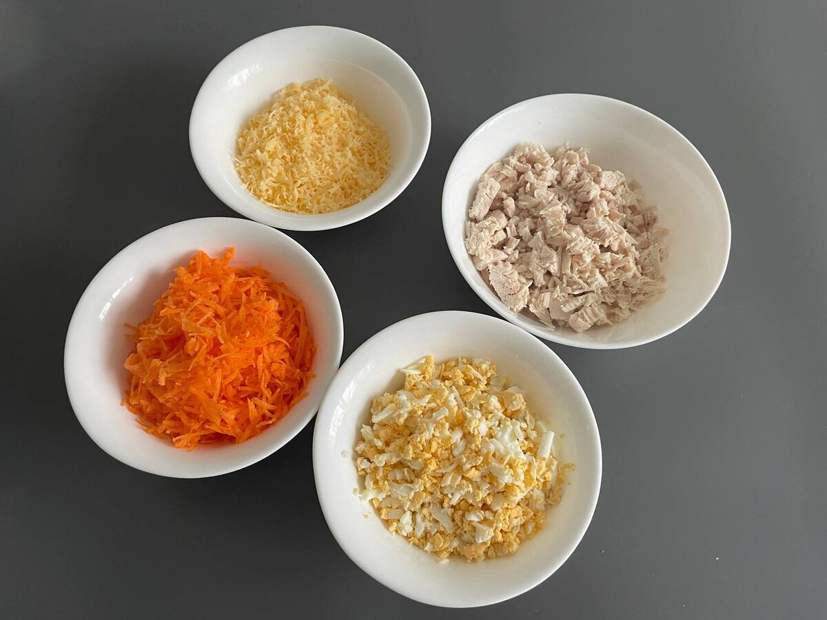Это очень вкусный и сытный салат, который можно приготовить и на праздничный стол, а главное, не надо искать где купить сложные ингредиенты, все просто и доступно. В моем кулинарном блокноте, где я записываю от руки все понравившиеся рецепты, тот салат есть давно. В блокнот я записываю и рецепты из советских книг, чтобы не искать понравившийся рецепт. Хотя, сейчас все можно хранить в электронном виде, но мне нравится записывать все в кулинарный блокнот. 📝 Есть среди вас такие же, как и я записывальщики рецептов?) Добрый день друзья! Сегодня на канале «Кухня СССР» рецепт салата «Курочка под шубкой». Есть «Сельдь под шубой», там свёкла, а здесь морковь и все тоже интересно и вкусно. Салат может быть на столе полноценным блюдом, ибо это очень сытно, вкусно. ✅ Куриное филе — 120 г (вес уже вареного филе) ✅ Морковь — 1 средняя (или 2 маленькие как у меня) ✅Сыр российский — 60 г ✅Куриные яйца — 2 шт ✅Чеснок — 1-2 зубчика ✅Майонез — 2 ст. л. Заранее сваренное куриное филе охлаждаем и нареза