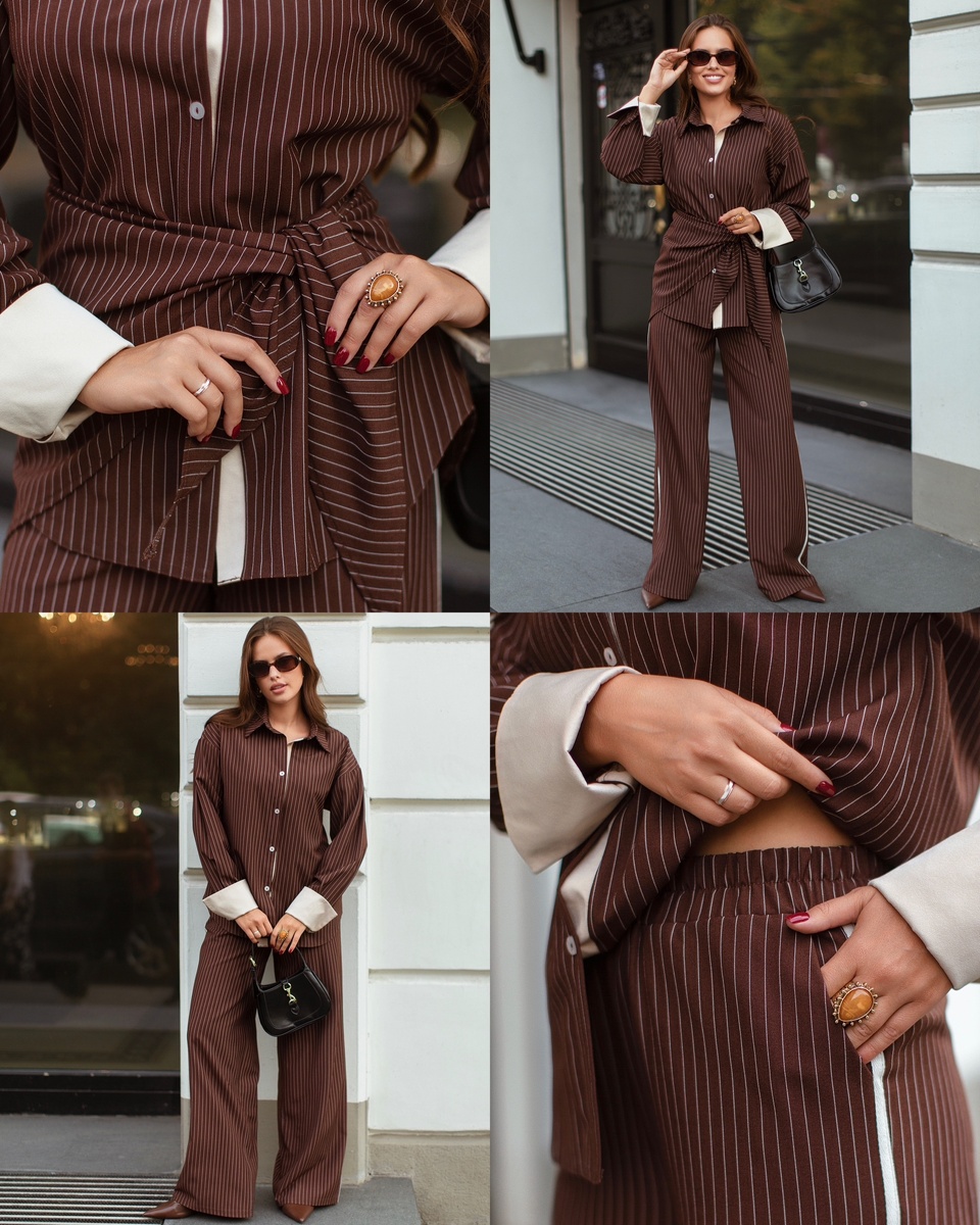 Представьте кашемировое пальто цвета тёплого какао, под ним — шёлковая рубашка цвета латте и кожаные брюки в тоне горького шоколада. Добавьте золотые украшения и объёмную сумку цвета коньяка — и вы получаете образ, который выглядит на миллион. Или сразу возьмите костюм тотал-браун! Совет стилиста: сочетайте матовые и блестящие фактуры — кожа, шёлк, шерсть. Это придаёт глубину и визуальный объём. Лук 2. Контраст