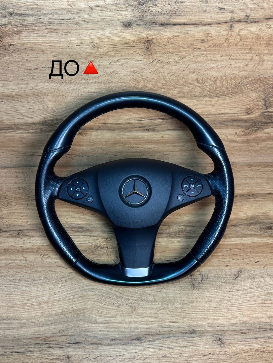 Годы эксплуатации сильно потрепали руль Mercedes E-class. Имелись потёртости, внешне он уже устал. Перетянули в натуральную кожу, по бокам - псевдоперфорация, прошито коричневой нитью.