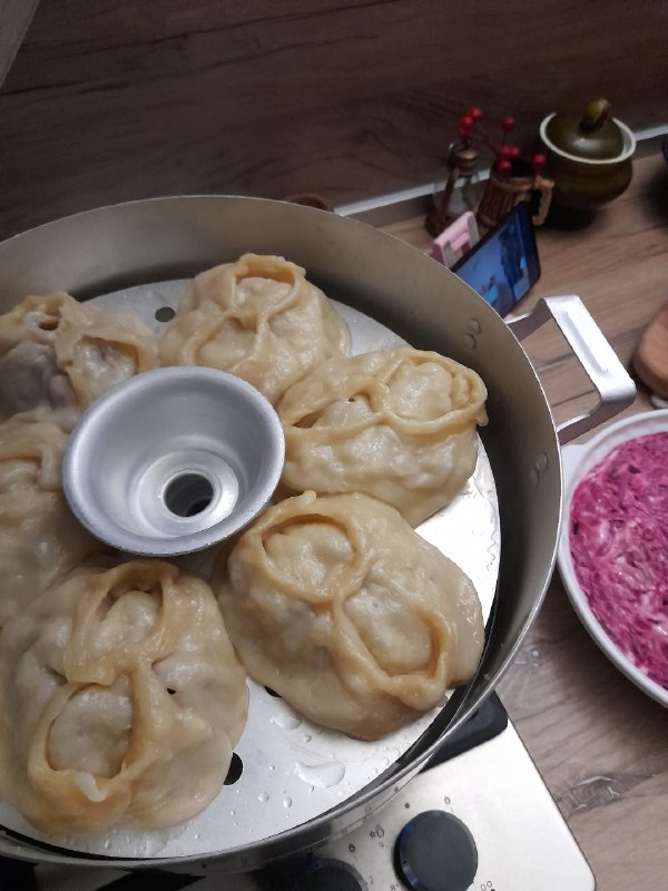 Смажьте ярусы мантоварки маслом, выложите манты.