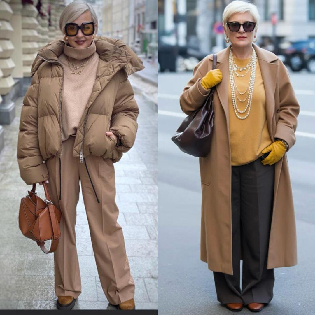 В принципе образ-то неплохой. Во-первых, тут роскошные, теплые оттенки и цвета, которые очень хорошо подходят цветотипу Весна. Но, и для осеннего цветотипа тоже будут неплохи. Но вот, такое ощущение, что конкретно этой женщине, данная палитра не совсем подходит. К тому же смотрите, здесь как раз вот это вот соотношение длины верха к низу, не соблюдено. Здесь как раз свитер как будто бы делит фигуру пополам, тем самым, нарушая гармоничность пропорций. К тому же надетое сверху пальто усиливает это и создает некое ощущение приземистости. Конечно, если у вас рост от 170 и выше, то соблюдением таких пропорций и соотношений можно, в принципе, пренебречь. Ну а всем остальным я рекомендую придерживаться этих гармоничных соотношений, если есть задача сделать себя визуально выше и стройнее). Так же в образе на фото справа стилистически абсолютно неуместно такое большое количество жемчужных бус. На мой взгляд, это и самой женщине не очень подходит, и не соответствует ее стилевой ДНК. И в цел
