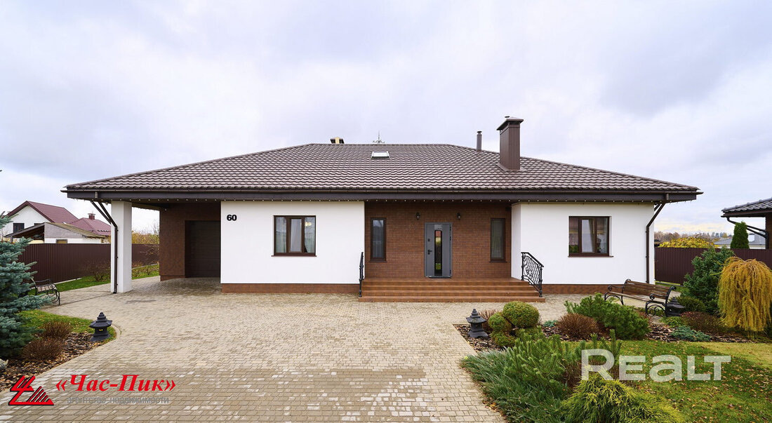 В 10 минутах от Минска продается стильный коттедж, полностью готовый к заселению. Плюсы его очевидны: практически новый, с добротной мебелью и двумя санузлами, к дому пристроен большой гараж, есть автонавес, участок благоустроен. Из нюансов – он находится в садовом товариществе. Но, по факту, это современный коттеджный поселок с респектабельной застройкой, центральными коммуникациями, большими участками и широкими улицами. И почем этот дом продается? СТ «На Птичи» находится всего в 12 километрах от станции метро «Малиновка». Поселок современный и с классическими дачными его связывает лишь дачный статус. В остальном же это довольно большой развивающийся коттеджный поселок. Застройка респектабельная, на въезде – шлагбаум. Логично, что здесь строят дома для круглогодичной жизни. Этот одноэтажный коттедж с гаражом не исключение – владельцы явно задумывали его как полноценное загородное жилье. Построен по индивидуальному архитектурному дизайн-проекту. Фундамент монолитный железобетонный, с