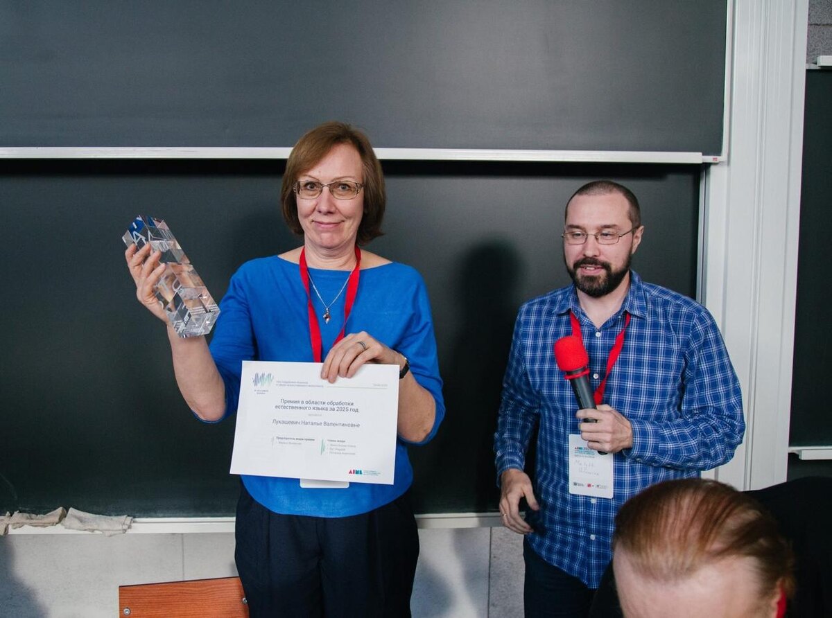 всем привет, мы открыли подачу заявок на Премию имени Владимира Иосифовича Левенштейна за 2026 год; премия вручается за вклад в развитие русскоязычного NLP-сообщества, как научный, так и в виде open source; если знаете, кому это релевантно, - перешлите или заполните форму за него ссылка на подачу заявок, заявки принимаются до 31 декабря на фотографии - Наталья Валентиновна Лукашевич, первый лауреат премии, и я @valuableai