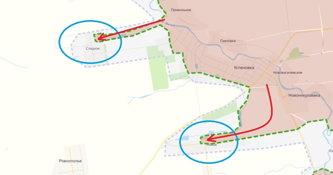 В юго-восточных степях каток продолжает мчаться, лететь, в прямом смысле этого слова, вперёд! Сегодня официально подтверждено, что наши укрепились сразу в двух населённиках: Причём отметим, что именно укрепились, а не взяли их. Такие новости всегда приходят с некоторой задержкой в 1-2-3 дня, т.е. сегодня парни могут быть уже далеко отсюда, каток работает отлично. Жёлтой рамкой выделили единственный населённик, который отделяет нас от главной цели нынешнего этапа продвижения (синяя рамка). Ещё может неделю назад Ровнополье казалось далёким тылом, а сейчас мы подходим к нему вплотную и нет гарантии, что оно также за пару дней не станет нашим, а там прямая дорога до окраин города, которая также не кажется непреодолимым барьером, тем более для нашего катка, который за последние 4 дня взял 5 населёнников. Пусть они не все большие, но тем не менее, это большое достижение, говорящее о многом. Например о том, что с той стороны ничего не могут противопоставить нашему уверенному продвижению. Оно