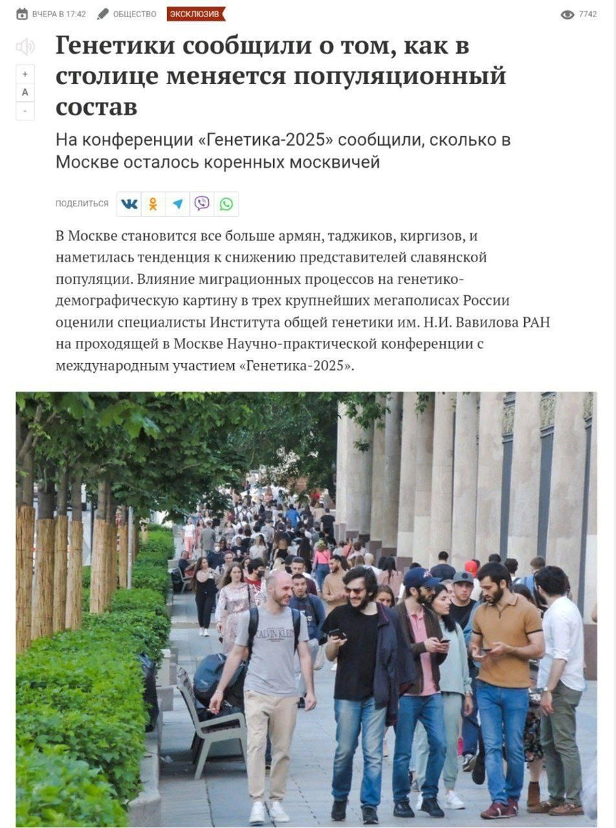 В Москве становится все больше армян, таджиков, киргизов, и наметилась тенденция к снижению представителей славянской популяции. Влияние миграционных процессов на генетико-демографическую картину в трех крупнейших мегаполисах России оценили специалисты Института общей генетики им. Н.И. Вавилова РАН на проходящей в Москве Научно-практической конференции с международным участием «Генетика-2025». Источник... И именно в мегаполисах наблюдается огромный приток мигрантов, который проводит к замене генофонда коренного населения, расширению этнического состава, неоднородному расселению этнических групп по городу, росту межэтнических браков и существенным межпоколенным различиям. Карта рождаемости детей у разных этнических групп все это показывает. Приоритет за узбеками, азербайджанцами, армянами. Такие различия в количестве детей будут в будущем влиять на количественный и конфессиональный состав населения России. Все, кто так или иначе копался в данной теме натыкаются на деятельность Властей Р