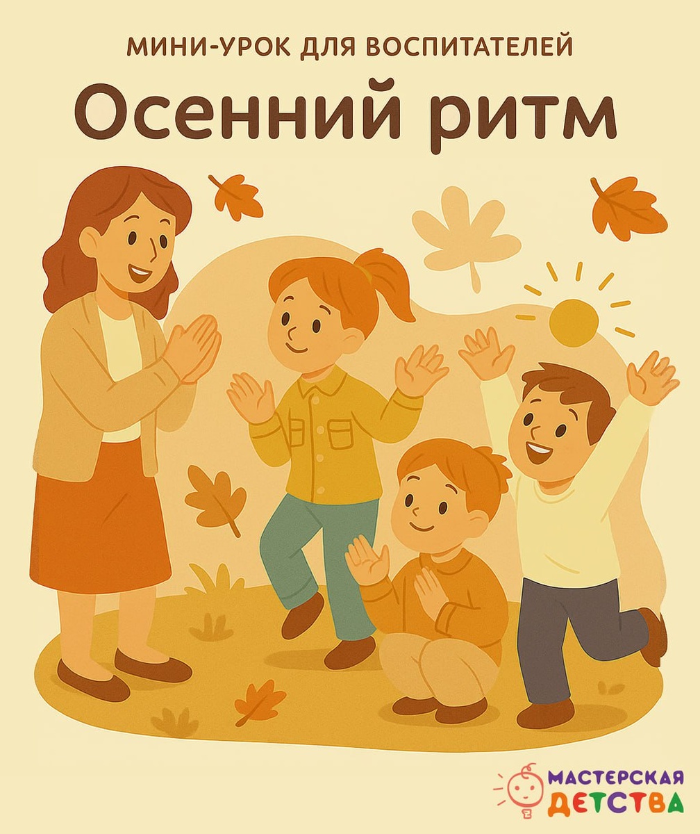 🍁 Мини-урок для воспитателей Осенний ритм: игра на хлопки и шаги с эмоциональной разрядкой Осень - время перемен, когда важно помочь детям выплеснуть накопившуюся энергию и вернуть эмоциональное равновесие. Простые ритмические игры - отличный способ снять напряжение, развить слух, внимание и чувство единства в группе. 🧩 Цель игры Развивать чувство ритма, внимание, координацию движений и умение взаимодействовать в команде. 🎵 Как провести 1️⃣ Подготовка Создайте уютное осеннее настроение: можно включить лёгкую фоновую музыку или предложить детям представить, что они листья, кружась под ветром. 2️⃣ Ритмическая разминка Педагог задаёт ритм хлопками и шагами - дети повторяют. — 2 хлопка — 2 шага — 3 хлопка — приседание — 1 хлопок — поднять руки «к небу» Можно менять темп, добавляя игровые команды: 🍂 «Подует ветер» — дети машут руками 🌧 «Пошёл дождик» — стучат пальчиками по полу 3️⃣ Эмоциональная часть После активных ритмов педагог предлагает замедлиться: — «А теперь осень засып