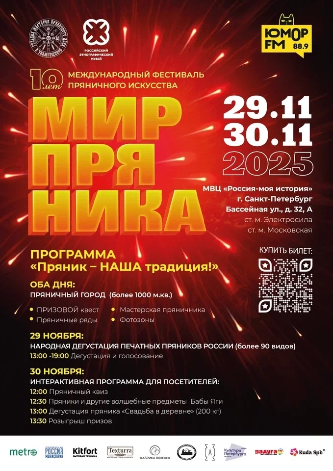 Дорогие друзья! С 29 по 30 ноября 2025 года в музейно-выставочном центре «Россия – Моя история» состоится юбилейный, десятый, Международный фестиваль пряничного искусства «Мир пряника». Гостей ждет погружение в мир, где центральная фигура — пряник — не просто угощение, а целое искусство, пронизанное любовью, памятью и теплом рук мастеров. Мастера со всей России, виртуозно владеющие искусством вырубки, вырезания и росписи пряников, превратят обычное лакомство в настоящее произведение искусства. В рамках фестиваля гости смогут посетить Чемпионат России по печатному прянику, увидеть, как в руках резчиков на гладкой поверхности дерева появляются замысловатые узоры, расписать свой пряник и увезти с собой не просто сувенир, а кусочек праздника. На фестивале вас ждут пряничные фотозоны, выставки обрядовой выпечки, Архангельской козули, реплики пряничных досок из Западной Европы, пряничный квиз, дегустации пряников и пряничные ряды! Экскурсоводы расскажут о секретах пряничных традиций, а также